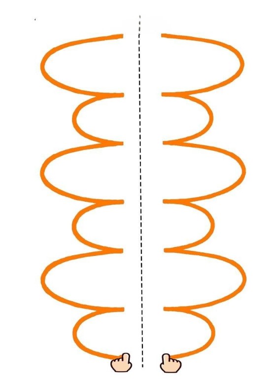 7. Проведення пальцями по спіральних доріжках у двох напрямках одночасно. Тренується витривалість уваги та точність рухів.