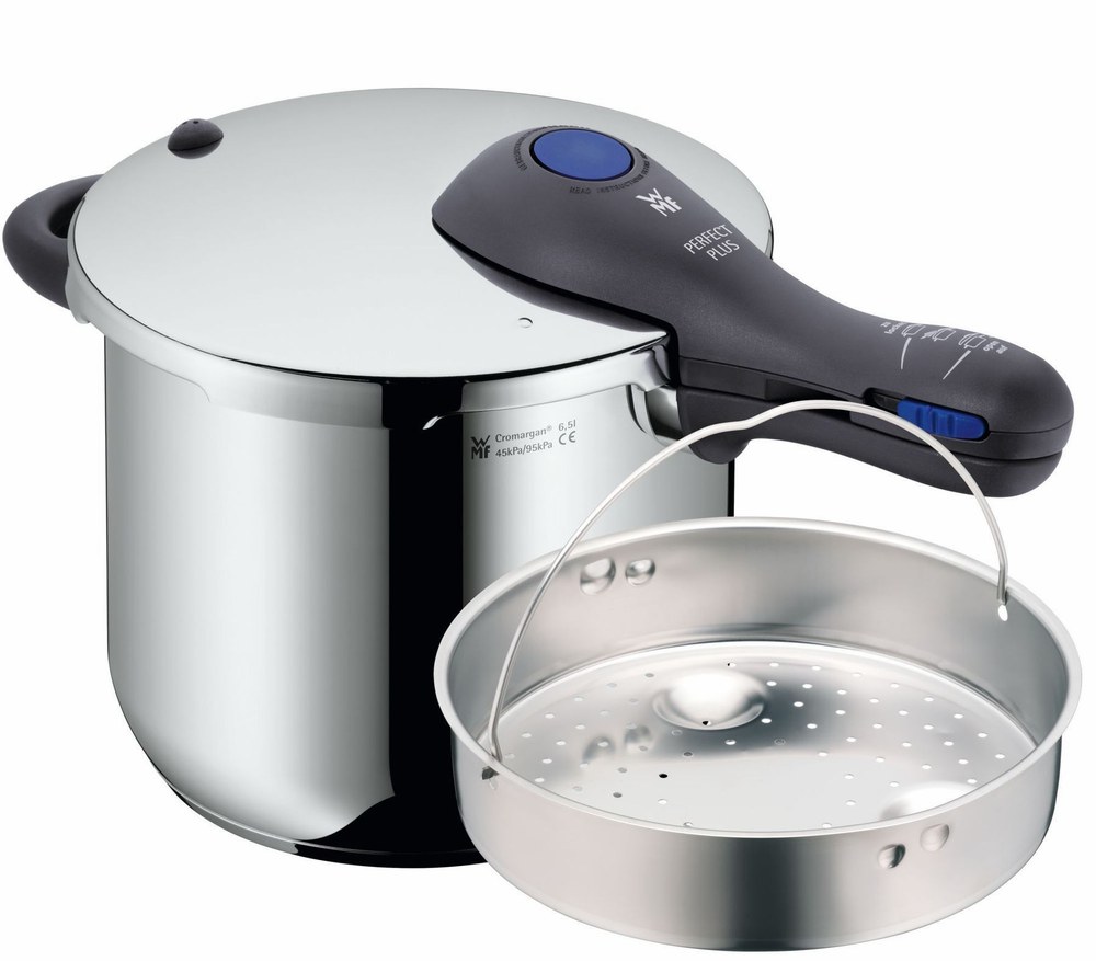 Тому прилад служить довше та працює стабільно. Наприклад, модель WMF Perfect 4.5 л зроблена з нержавіючої сталі Cromargan® 18/10 і має базу TransTherm®, що забезпечує рівномірне нагрівання на будь-якій плиті. Ця якість помітна навіть у деталях: набір із 6,5 л + 3 л від того ж бренду має знімну ручку, індикатор тиску й семирівневу систему безпеки. Наявність таких характеристик означає, що модель виготовлена не для “туди-сюрприз”, а для багатьох років використання.