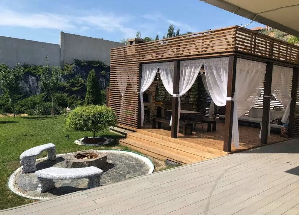 Лайфхак для практичных хозяев – уличные шторы можно сочетать с гирляндой или светодиодной подсветкой, и тогда вечерняя веранда превратится в уютное кафе прямо у дома.